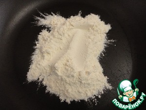 Муку просеять и прокалить на сухой сковороде 30-40 секунд.