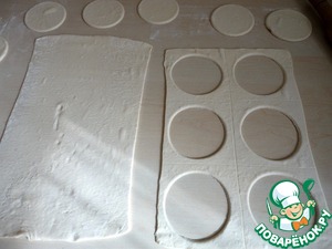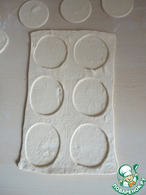 Тесто разморозить, раскатать в одном направлении оба пласта. На одном наметить ножом 6 квадратов и вырезать по центру круги. Они нам тоже пригодятся.