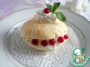 Начинить взбитыми сливками. Украсить ягодами красной смородины и листиками мяты.