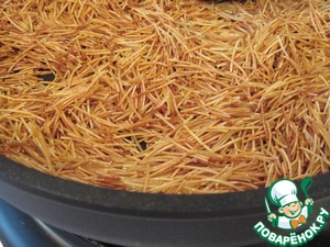 В это время на раскаленную сковороду выложим вермишель, капнем ложку масла, перемешаем.