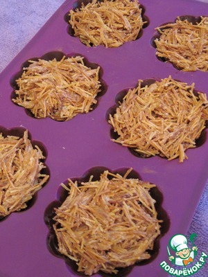 По истечении времени выложим на джем вермишель со сгущенкой, хорошо ее уплотним. Как сделать, чтобы во все формочки хватило начинки. Я взвесила на электронных весах вермишель, узнала вес, разделила на 6 формочек, и по весу разложила в каждую формочку.