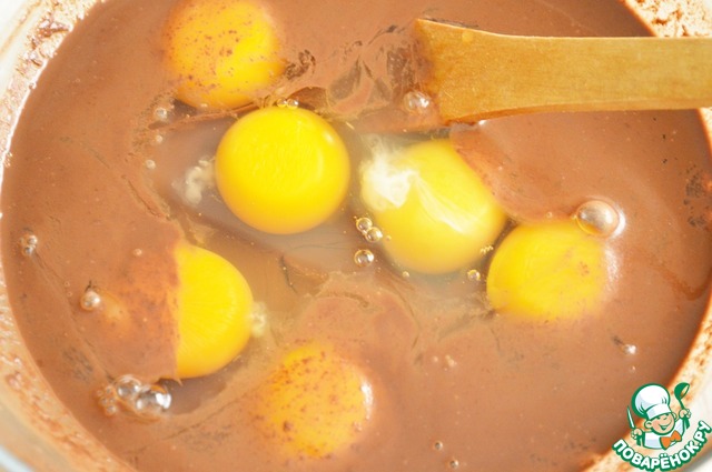 К шоколаду добавить яйца и слегка взбить венчиком или вилкой.
