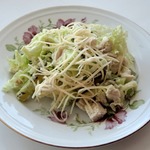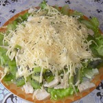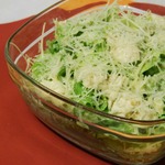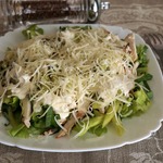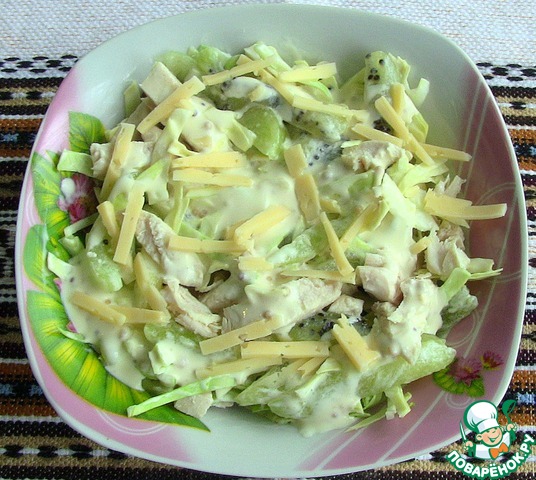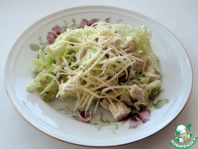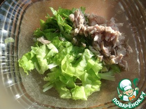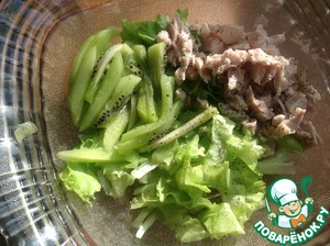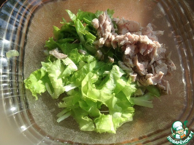 Салат нашинковать и добавить к нему мелко порезанную грудку.