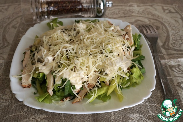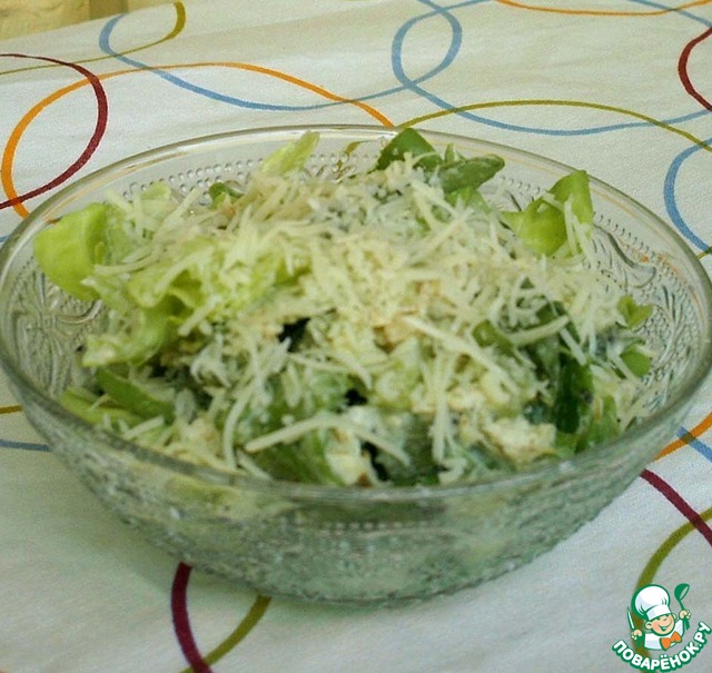 Заправить заправкой и сверху украсить сыром тертым на мелкой терке.