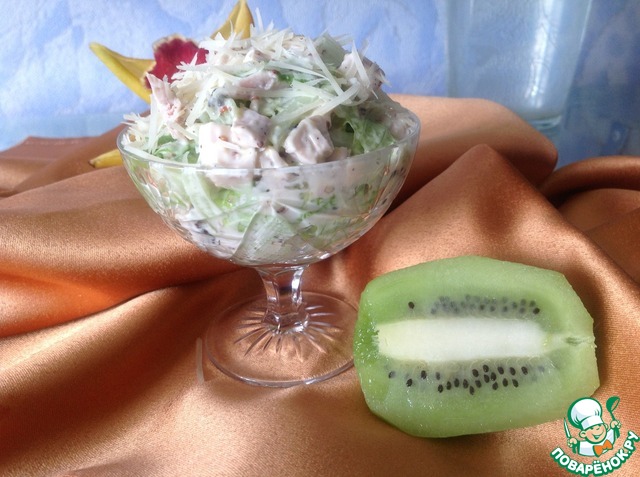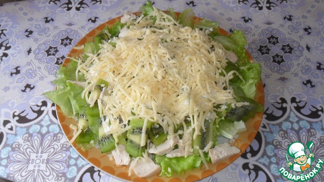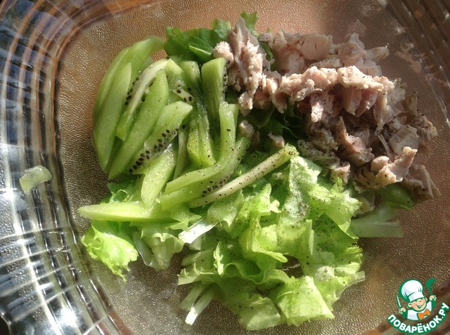Киви очистить и порезать соломкой, добавить к салату. Посолить, поперчить и аккуратно перемешать.