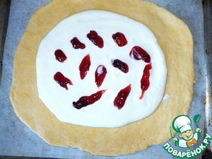 Тесто раскатать на пергаменте, аккуратно перенести на противень, в середину выложить творожную начинку. Сделать полоски из джема