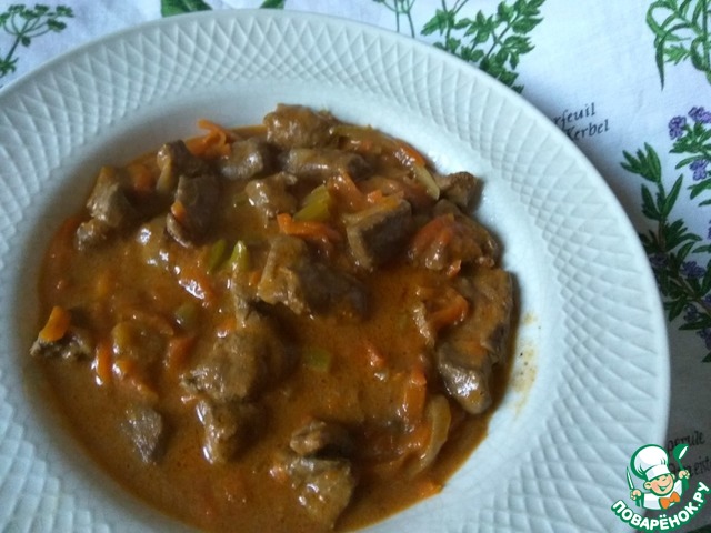 После того, как наша печеночка потушилась с овощами, и они стали мягкими, вливаем в сотейник смесь из сметаны и томатной пасты. Добавляем соль, кориандр и зелень по вкусу.