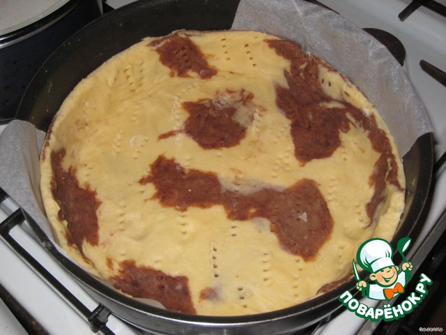 маргарин растереть в крошку с мукой, сахаром и разрыхлителем. Добавить воду и замесить тесто. Отщипнуть небольшой кусочек теста и добавить в него какао. Получается два вида теста (белое и шоколадное). Можно этого не делать, а сделать обычную белую основу, мне вот захотелось сделать мраморную основу, но я поторопилась и не перемешала как следует два теста между собой и получились не шоколадные разводы, как задумывалось, а родимые пятна, но на вкус не повлияло ))))))))