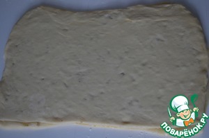 Тесто разморозить, тонко раскатать и разделить на две равные части.