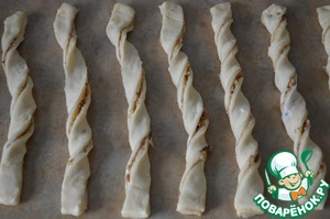 Скрутить несколько раз. Выложить на смазанный растительным маслом противень, прижать края у каждой слойки. Смазать палочки взбитым яйцом, посыпать сахаром, который остался. Выпекать в предварительно разогретой духовке при температуре 200 градусов 10-12 минут до золотисто-коричневой корочки. Полностью охладить.