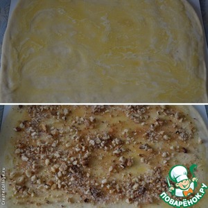 Одну часть по всей поверхности смазать растопленным сливочным маслом. 2 ст. л сахара смешать с корицей и посыпать тесто. Сверху равномерно распределить измельченные грецкие орехи (или любые другие по вашему вкусу).