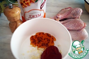 Готовим маринад: в миске смешиваем облепиховый джем, томатную пасту, соль, перец, измельченный чеснок, розмарин и майоран. Тщательно обмазываем голени и оставляем мариноваться на полчаса.