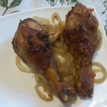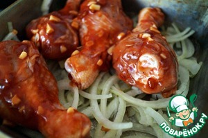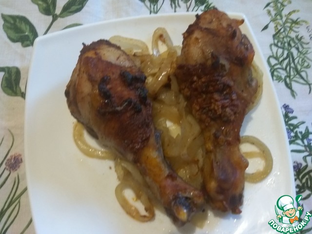 После этого в небольшую форму кладем нарезанный полукольцами лук. На него выкладываем куриные голени. Выпекаем при Т 180 градусов 40 минут.
