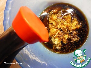 В отдельной емкости смешиваем сок имбиря (я, кстати, люблю жмых от этого острого корня, так что немного отошла от рецепта - это дело вкуса), чеснок, соевый соус и