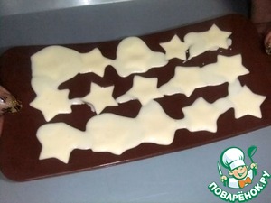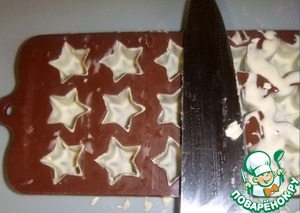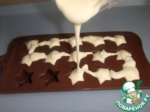 В это время растопить шоколад на водяной бане. По правилам его надо темперировать: нагреть до 45 гр, остудить до 27, затем снова нагреть до 35 гр, но можно проще, не на продажу ведь делаем, да и хранить эти конфеты вряд ли придется. Залить в формочки.