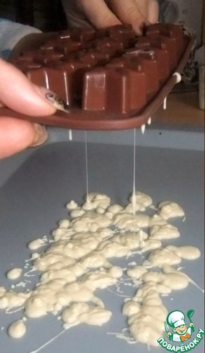 Перевернуть форму и, слегка потряхивая, вылить шоколад на поднос. Затем собрать вылитый шоколад обратно в чашку.