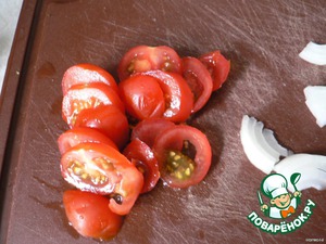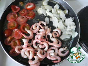 Выложите на сковородку все ингредиенты. Не смешивайте лук с помидорами, иначе лук не поджарится, а сварится. А креветки - все равно.