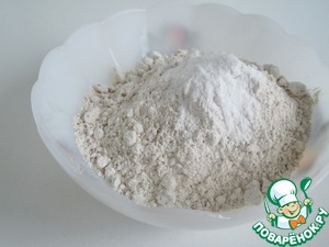 Цельнозерновую муку (150 гр) смешать с 1 ч. л. разрыхлителя и просеять.