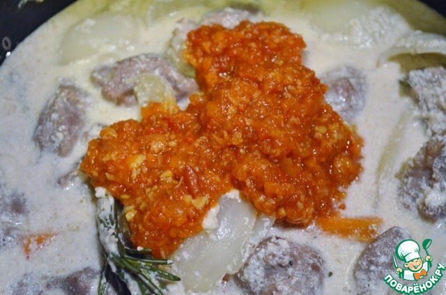 Закрываем мультиварку и доводим до готовности. Мясо с овощами выкладываем на тарелку, а в оставшийся соус добавляем муку, хорошо размешиваем. Поливаем мясо полученным соусом.
