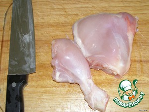 Поставить закипать воду (если есть куриный бульон, только приветстуется). Подготовить курицу. В оригинале - необходимо куриное филе и ее же ножки. Мне подумалось, что вполне достаточно окорочка.
