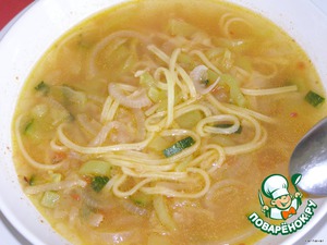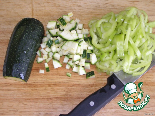 Нарезать болгарский перец и цуккини, добавить в кипящий суп. Опять же, оригиналом рецепта предполагался еще и зеленый горошек, но я его в супе не люблю, поэтому принципиально не добавила.
