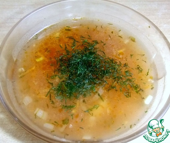 В готовый суп добавить толченый чеснок и зелень и дать настояться 5 минут.