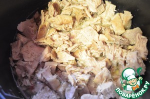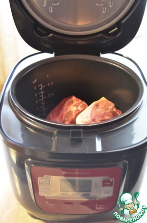 Нарезанное мясо необходимо поместить обратно в чашу мультиварки, мясной бульон должен чуть прикрывать мясо, если у вас очень мало бульона, то можно немного добавить воды.