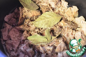 Далее добавляем в чашу специи, лавровый лист, выдавливаем чеснок, добавляем желатин. Включаем мультиварку в режим «Тушение» еще на 50 минут.