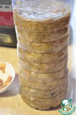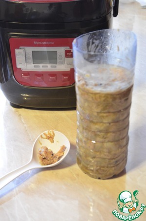 По окончании заданной программы, выключаем мультиварку, отключаем питание и открываем крышку, пусть наш зельц немного остынет, убираем листья лаврушки. Далее берем пластиковую бутылку 1.5 литров (у меня из-под детской воды), отрезаем горлышко и выкладываем зельц.