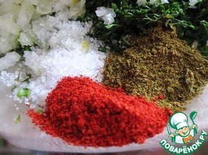 Смешать нарезанное мясо с луком, зеленью и приправами. Хорошо перемешать. Добавить желатин сухой и тоже перемешать.