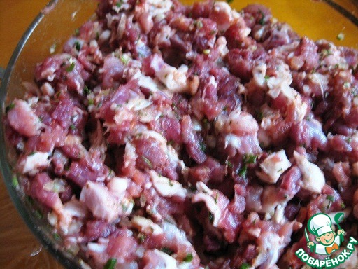 Нарезать свинину и говядину мелкими кусочками, жир нарезаем вместе с мясом.