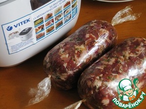 На пищевую пленку выложить получившуюся массу и свернуть. Края пленки завязать.