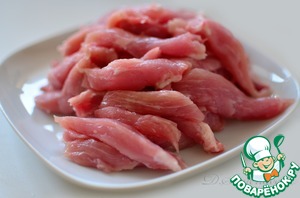 Мясо промыть, обсушить и постараться нарезать его тонкими длинными брусочками.