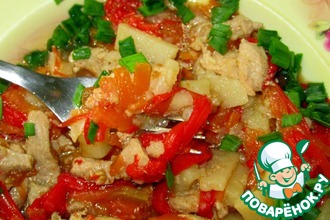Мясо и окорочка нарежьте крупными кусочками. Лук, перец на четвертинки. Морковь - оставить целиком (либо нарезать на половинки). Посолить 1,5 ч. л. соли. Долить водой (у меня около литра). Практически весь бульон у Вас потом останется, так что старайтесь не наливать воды много. Включить программу "Тушение" на 2 часа (в моей мультиварке Vitek VT-4210ВК максимальный шаг на программе "Тушение" составляет 1 час, я включала программу два раза подряд).