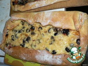 Раскатайте тонко тесто. Выложите его на смазанный сливочным маслом протвень и смажьте кетчупом. Выложите кусочки колбасы. Сверху - лук. Потом грибы, потом маслинки. Потом кружки помидоров. Сверху натрите на крупной терке сыр. На края пиццы на тесто положите кусочки сливочного масла. Заверните края так, чтобы начинка не вытекла. Поставьте в духовку, разогретую до 180 градусов, минут на 25 -30. Следите, чтобы тесто не стало зажаристым - тогда оно будет сухим. Оно должно быть золотистого или светло-коричневого цвета.