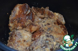 Мясо в сухарях выложить в мультиварку и готовить в режиме "Выпечка" 40 мин. Через 20 мин. после начала приготовления мясо переверните.