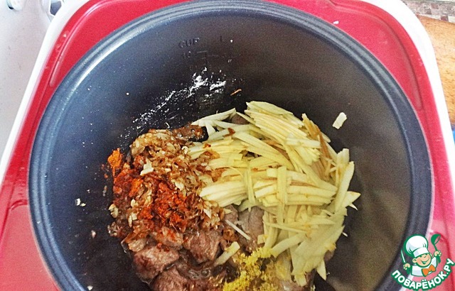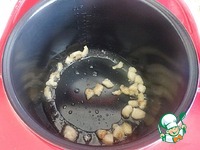 В чашу мультиварки сложить нарезанное курдючное сало и на режиме "поджаривание" обжарить его до золотистого состояния. |