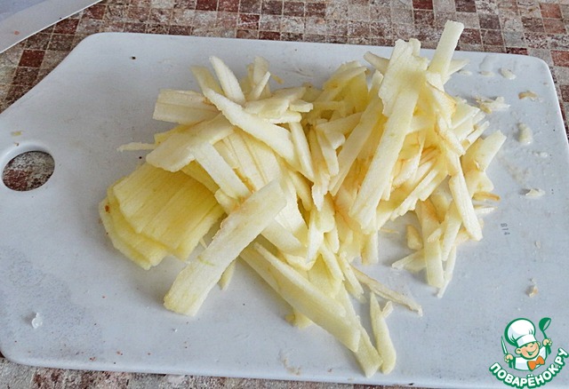 Пока жарится мясо, мы почистим яблоки от кожуры, освободим от сердцевины и нарежем их брусочками. |