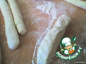 Сформировать колбаски. Колбаски разрезать на брусочки. Брусочки раскатать на сочни!