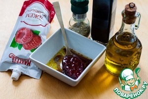 Приготовьте заправку - смешайте оливковое масло, бальзамический уксус, сушеные итальянские травы и добавьте малиновый джем Махеевъ. Этот замечательный вкусный джем придаст нашей заправке вкус лета.