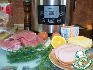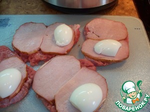 На подготовленную отбивную выкладываем ломтики ветчины и яйцо, разрезанное вдоль.