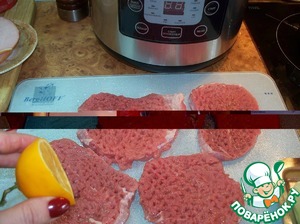Мясо отбиваем, солим, перчим, поливаем лимонным соком.
