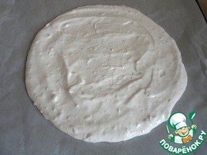 Выложить безе на пергамент и запекать в предварительно нагретом до 150 гр. духовом шкафу 60 минут.