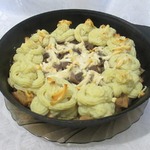 Когда картофель сварится, слить отвар, картофель обсушить, растолочь в пюре. Добавить сливочное масло, 1/4 стакана молока и 1/2 взбитого яйца. Перемешать.