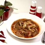Тематика очень близка к греческой кухне, именно оттуда была позаимствована идея. Кусочки говядины, тушенные в густом соусе с необычными макаронными изделиями. Количеством пасты вы можете превращать второе блюдо в сытный суп=) Это блюдо лучше делать в мультиварке, т. к. она позволяет делать мясо очень нежным. В создании блюда мне помогала прелестная мультиварка Vitek VT-4205 BK.