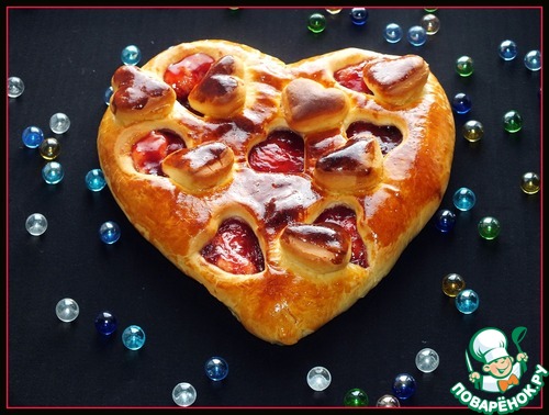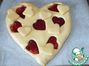 Сверху украшаем вырезанными сердечками, которые тоже нужно смазать желтком. Выпекать пирог при t-180* 20 минут (до красивого цвета).