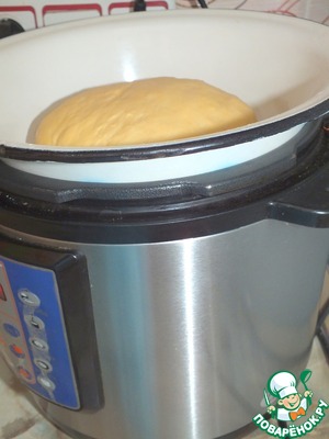Тесто положить в глубокую чашу и убрать в теплое место. Я для этого ставлю чашу с тестом на мультиварку и в включаю режим "хранение тепла". Чашу накрыть полотенцем.