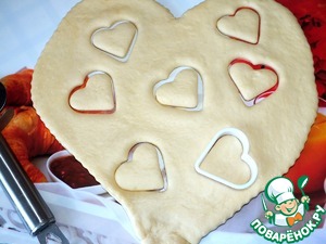 Взять маленький колобок, раскатать в пласт и вырезать сердце (я использую пиццерезку)