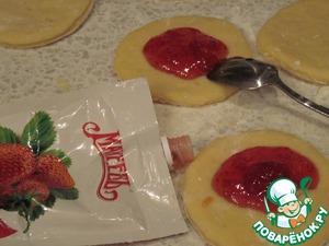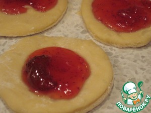 Выложим на тесто начинку, я взяла клубничный джем ТМ Махеевъ, он оказался очень ароматным.