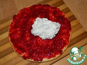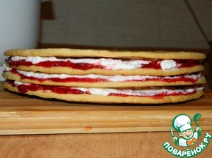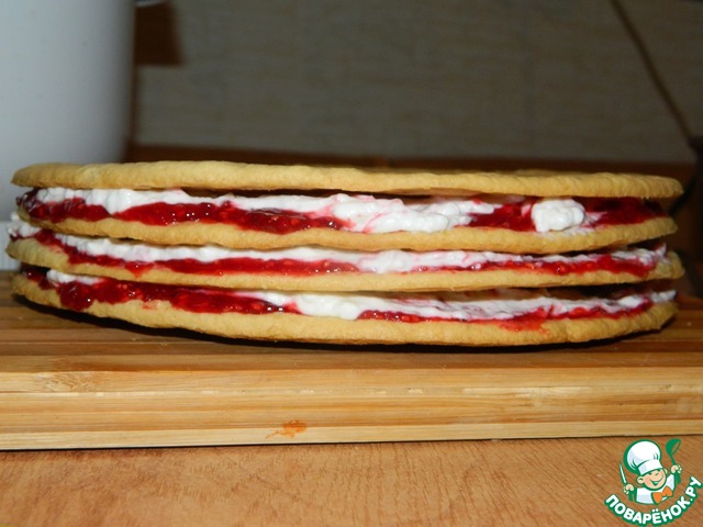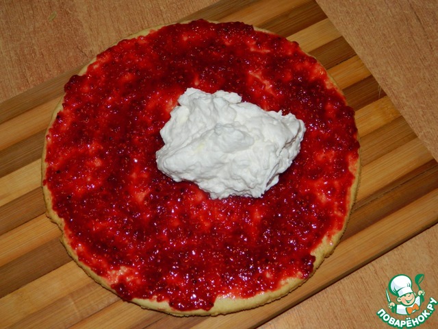 Смазываем по очереди 3 коржа джемом "Махеев" малиновый, а сверху сливочным кремом.